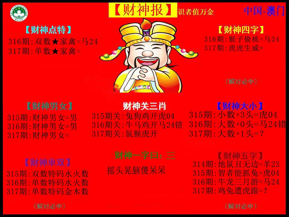 | 315期: 买啥都中 【地肖地肖地肖】开:虎04准 |
